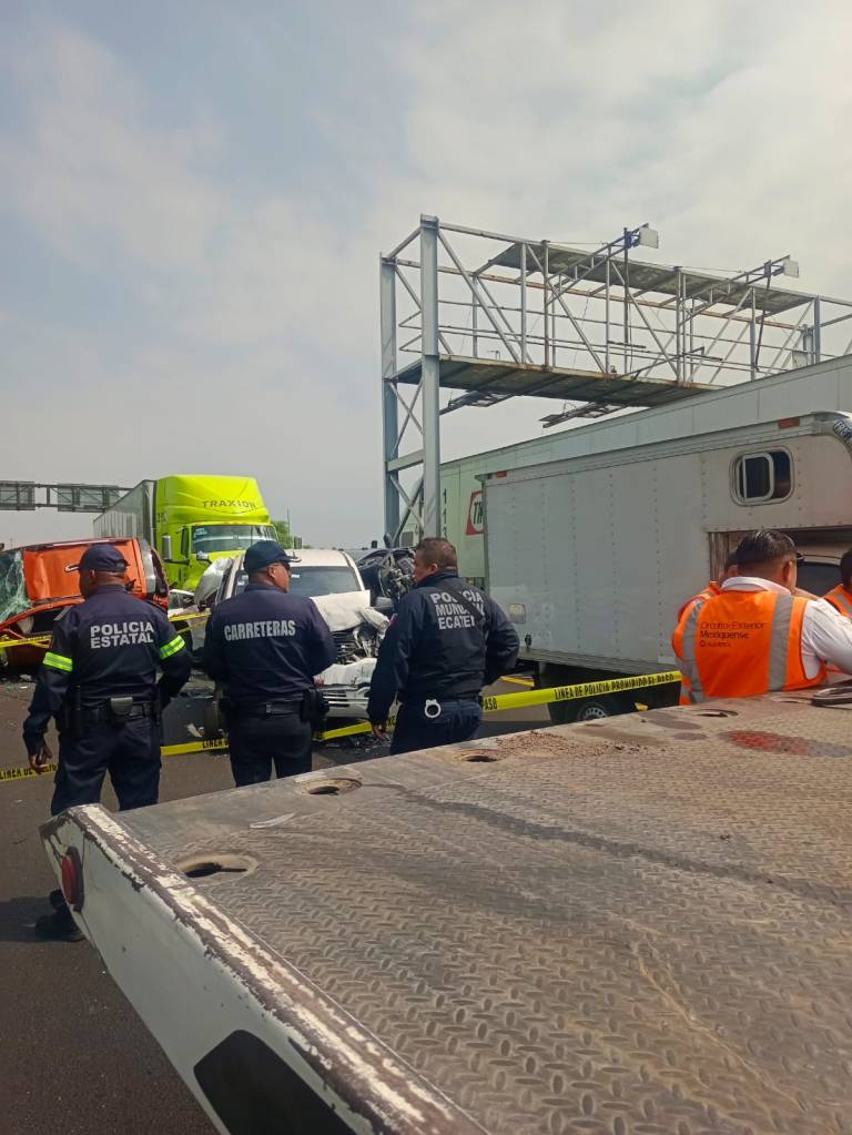 Ecatepec, Méx.- Elementos de Protección Civil y Bomberos laboran en la carambola registrada esta mañana en el kilómetro 36 del Circuito Exterior Mexiquense, luego de que un tráiler impactara a dos unidades de transporte público y siete vehículos particulares, en dirección a Puebla, que dejó 18 lesionados, un hombre fallecido y el chofer detenido.