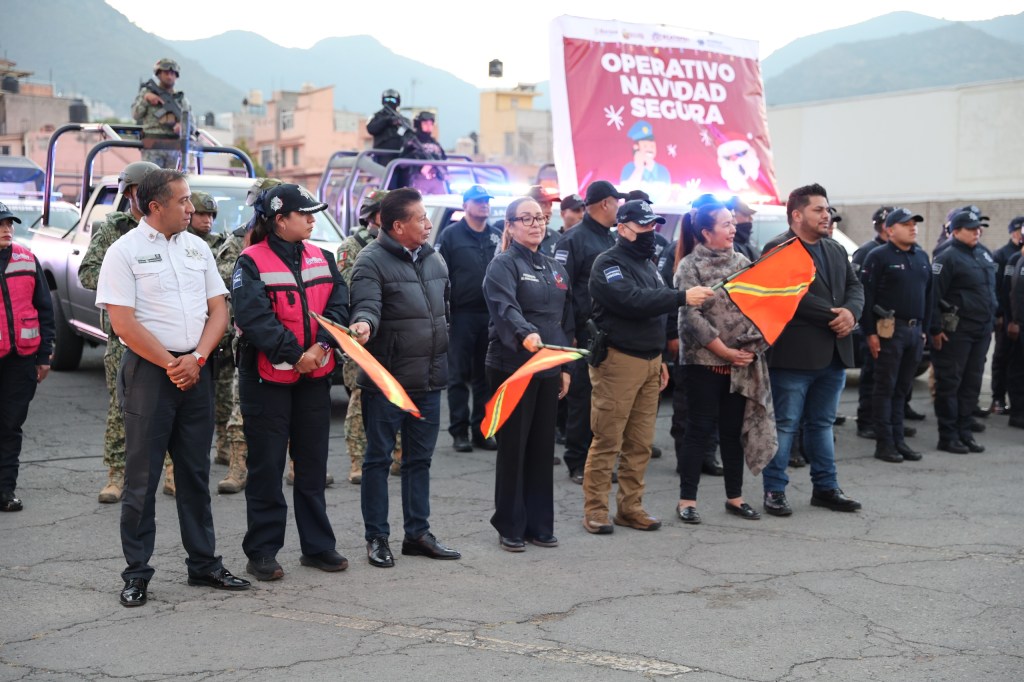 Ecatepec, Méx.- Para garantizar festejos decembrinos en paz y tranquilidad, la alcaldesa Azucena Cisneros Coss dio el banderazo al operativo Navidad Segura, que refuerza vigilancia en colonias y centros comerciales e incluye acompañamiento bancario a cuentahabientes, con la participación de cerca de mil elementos de la policía municipal, estatal, Marina, Guardia Nacional y Defensa.