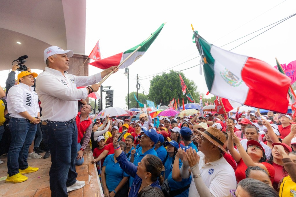 Bajo la lluvia, y en compañía de los presidentes de los comités municipales del PRI, PAN, PRD, NA y demás candidatas y candidatos de la Coalición, así como de los integrantes de su planilla, dijo que nada los debe detener, para no permitir que Morena tenga la mayoría calificada en las cámaras y el senado.