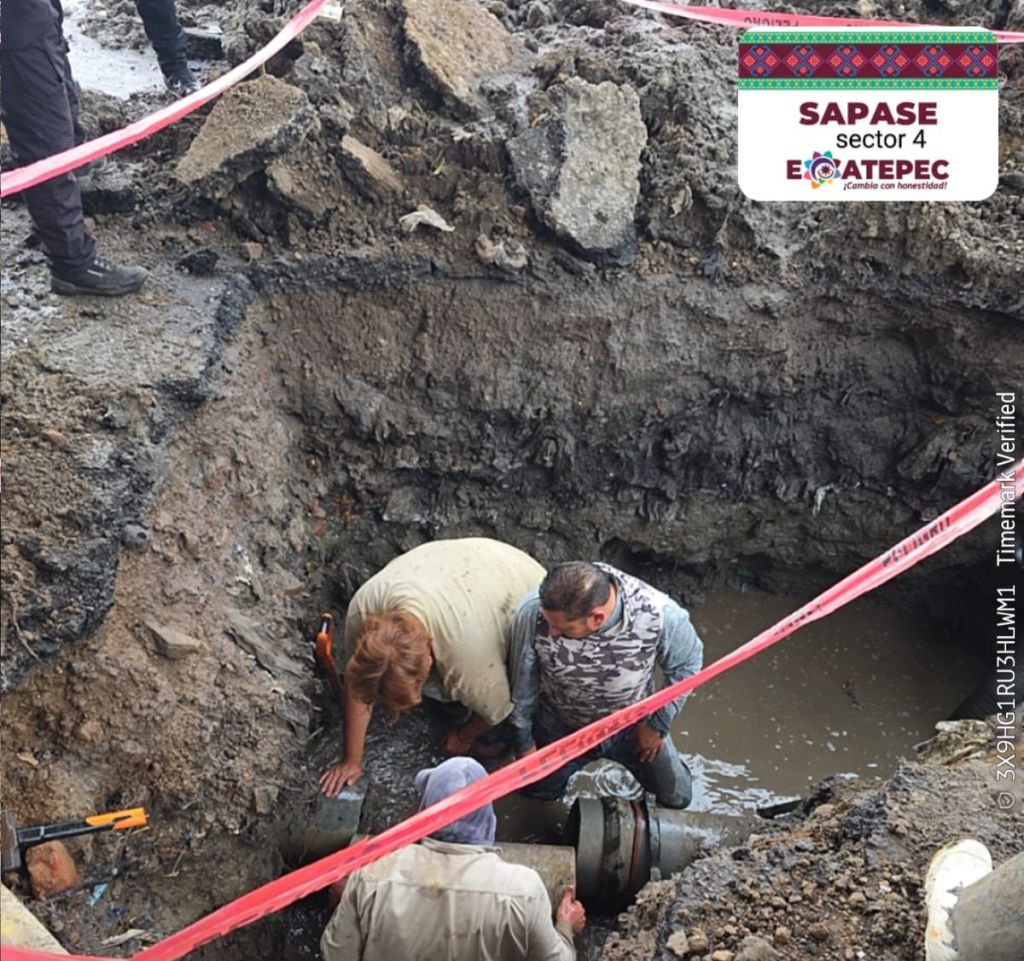 Ecatepec, Méx.- El organismo del agua de Ecatepec (Sapase) atendió la fuga de líquido que se presentó la mañana de este miércoles en avenida R-1, casi esquina con Río de Los Remedios, en la colonia Las Vegas Xalostoc.