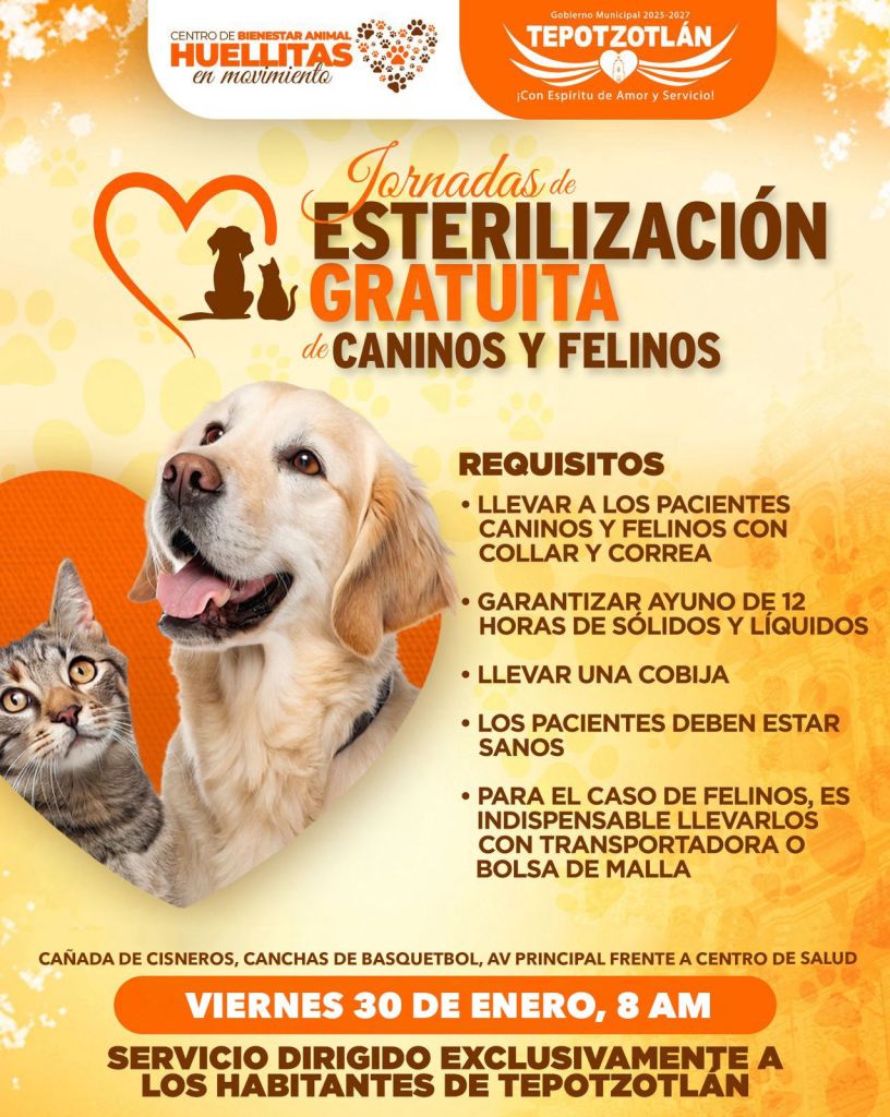 Tepotzotlán, Méx.- El Ayuntamiento de Tepotzotlán, encabezado por la Presidenta Municipal María de los Ángeles Zuppa Villegas, a través del Centro de Bienestar Animal Huellitas en Movimiento, invita a las y los habitantes de la comunidad de Cañadas de Cisneros a participar en la Jornada de Esterilización Gratuita de Caninos y Felinos, que se llevará a cabo el próximo viernes 30 de enero, a partir de las 8:00 horas, en las canchas de básquetbol ubicadas en la avenida principal, frente al Centro de Salud.