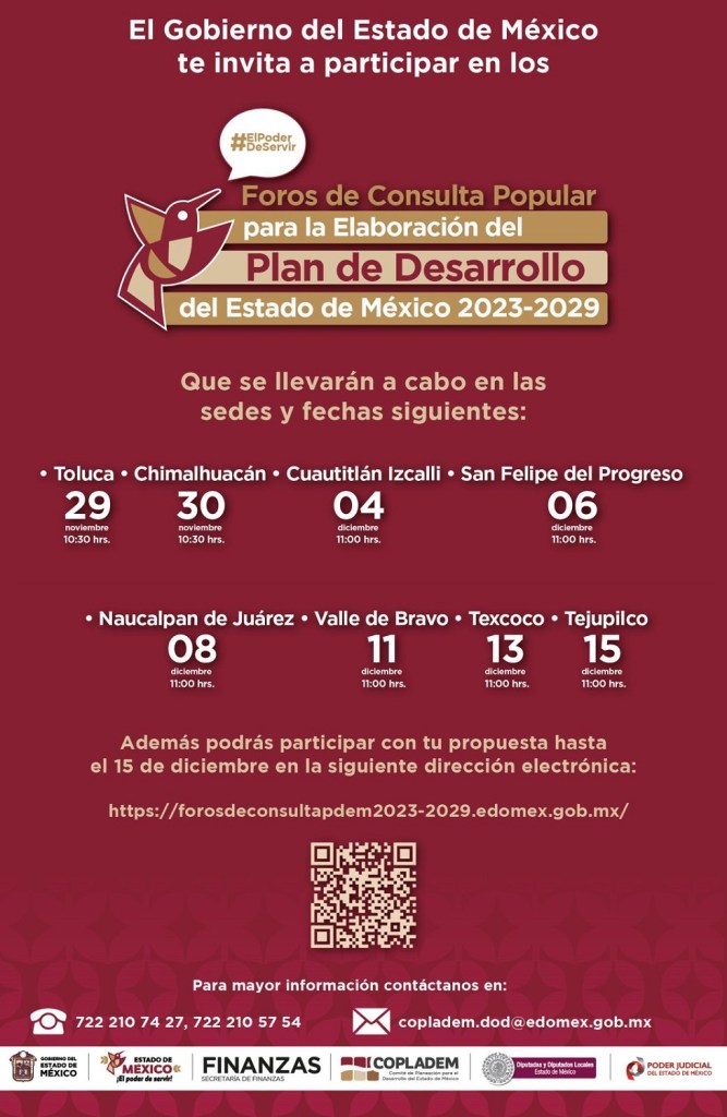 TOLUCA, Méx.- El Gobierno de la Maestra Delfina Gómez Álvarez dará inicio a los Foros de Consulta Popular para la elaboración del Plan de Desarrollo del Estado de México 2023-2029, el cual busca incorporar las propuestas de las y los mexiquenses en la construcción de la transformación de la entidad.