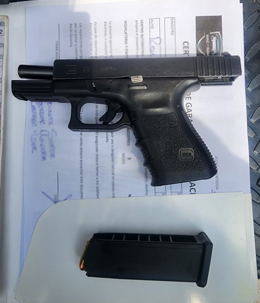 Tras consultar la información con el Centro de Control, Comando, Comunicación, Cómputo y Calidad (C5) de la SSEM, el automotor no contaba con reporte de robo, al continuar con la inspección, encontraron fajada a la cintura del sujeto, un arma de fuego tipo escuadra de marca Glock 25, calibre 380, milímetros, con un cargador abastecido con varios cartuchos útiles.
