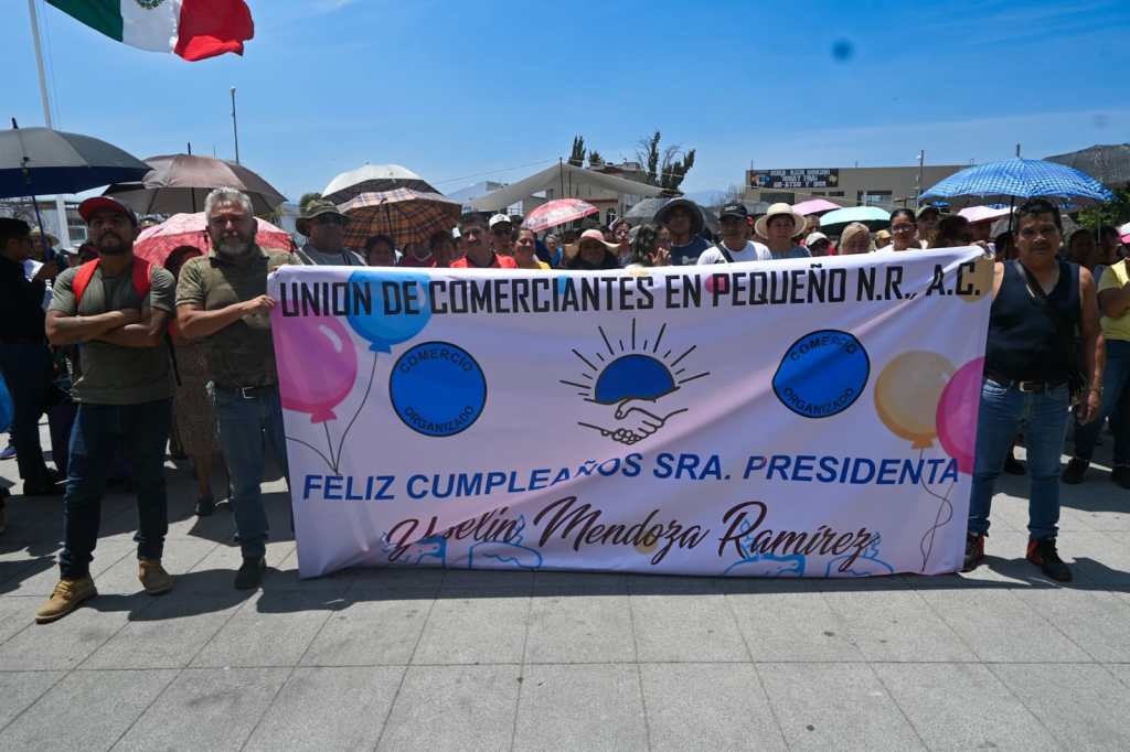 Nicolás Romero, Méx.- Hoy se vivió una manifestación diferente en la explanada del palacio municipal de Nicolás Romero, ya que más de 200 agremiados de la Unión de Comerciantes en Pequeño N.R. A.C., se reunieron para felicitar a la alcaldesa, Yoselin Mendoza, por su cumpleaños y manifestarle su agradecimiento por el apoyo que han recibido.