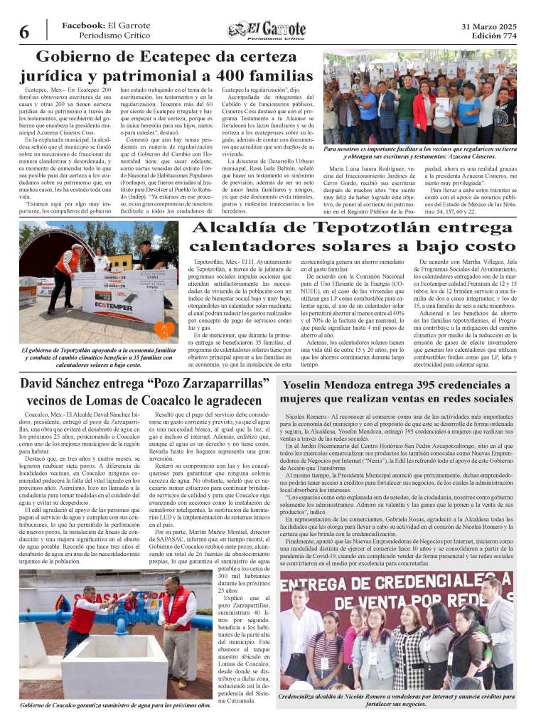 Anuncia Azucena Cisneros plan para atender socavones y evitar inundaciones. Ecatepec, Méx.- Con 100 trabajadores y 30 unidades especializadas, la presidenta municipal Azucena Cisneros Coss, dio el banderazo al Plan Emergente 200 Socavones y de Prevención a Inundaciones en la explanada municipal, que beneficiará a más 650 mil habitantes de Ecatepec. El programa incluye el desazolve en las zonas afectadas y será permanente, con la intención de estar listos para recibir la época de lluvias y mitigar la serie de inundaciones que se han presentado en años anteriores. “El gobierno de Ecatepec sigue trabajando parejo y sin distingo en todas las comunidades; hoy arranca el Plan Emergente contra inundaciones y vamos a atender al menos 200 socavones que llevan años sin atenderse y representan un riesgo a los vecinos”, afirmó. Además, anunció que su gobierno está capacitando a vecinos interesados en formarse como plomeras y plomeros que apoyen en la reparación de fugas de agua. En su intervención, el director del organismo de agua Sapase, Francisco Reyes Vázquez, precisó que el plan emergente incluye a 100 trabajadores, con el apoyo de 10 retroexcavadoras, 10 camiones de volteo y 10 equipos vactor. Explicó que el programa beneficiará a más de 650 mil habitantes de colonias como El Chamizal, Granjas Valle, Jardines de San Gabriel y Ciudad Azteca por mencionar algunas de las comunidades con mayores afectaciones por socavones, que durante seis años no se atendieron, principalmente en la Quinta Zona. El Director de Sapase, no descartó que durante los trabajos se localicen más socavones, sin embargo trabajarán hasta que sean reparados. “Vamos a tener programas integrales en las colonias donde están azolvadas las líneas de atarjeas, y será un trabajo permanente”, explicó. Por ello, anunció que en los próximos días Sapase realizará asambleas comunitarias, para aprobar el inicio de obras en las calles que requieren cambios de red y drenaje, y que se realizarán entre gobierno y vecinos.