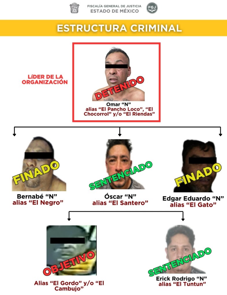 Diversas indagatorias establecieron que en el grupo delictivo de Omar “N” y/o Tomás Alejandro “N” y/o Erik “N”, también participaba Oscar “N” alias “Santero” y el 22 de enero del año 2021, ambos sujetos participaron en un robo con violencia y posterior homicidio de dos Policías Municipales de Tlalnepantla, de igual forma integraba la célula delictiva un sujeto identificado como Bernabé “N”, quien murió en ese mismo evento del robo; Edgar Eduardo “N”, privado de la vida en el año 2021 y un individuo de alias “El Gordo”, quien es un objetivo por detener.