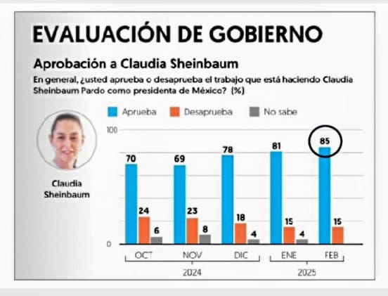 Cisneros Coss expresó que, de acuerdo a una encuesta realizada por El Financiero a nivel nacional en febrero pasado, la presidenta Claudia Sheinbaum, presentó una aprobación ciudadana del 85 por ciento, mientras que en otras mediciones Ecatepec es el territorio donde se registra una mayor anuencia.