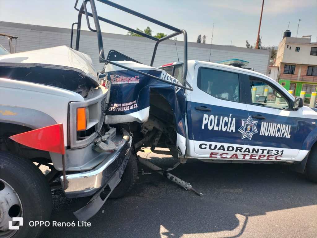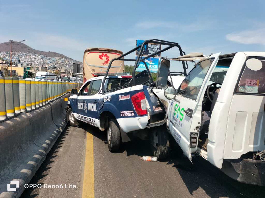 Ecatepec, Méx.- Una patrulla de la Dirección de Seguridad Ciudadana y Tránsito Municipal fue impactada en la parte trasera por una pipa de la empresa Gas y Servicio S. A. de C. V., cuando circulaba en la autopista México-Pachuca, lo que ocasionó lesiones a dos policías municipales, quienes fueron trasladados al hospital del ISSEMyM para su atención médica.