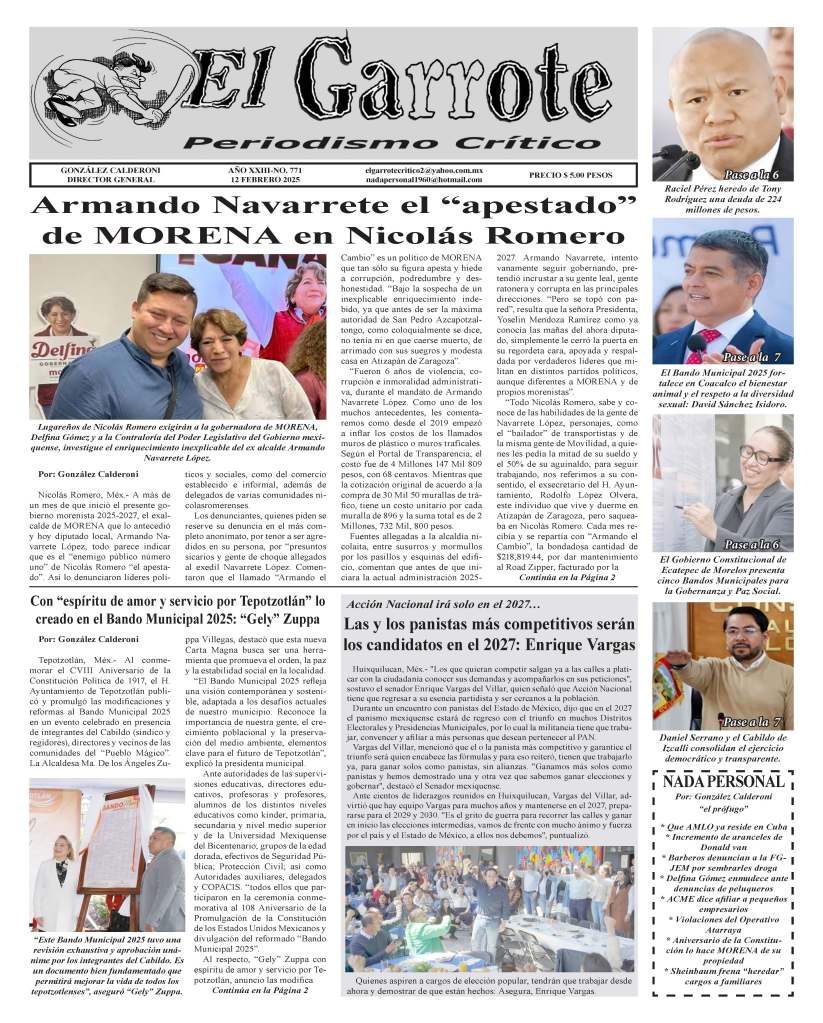 Nicolás Romero, Méx.- A más de un mes de que inició el presente gobierno morenista 2025-2027, el exalcalde de MORENA que lo antecedió y hoy diputado local, Armando Navarrete López, todo parece indicar que es el “enemigo público número uno” de Nicolás Romero “el apestado”. Así lo denunciaron líderes políticos y sociales, como del comercio establecido e informal, además de delegados de varias comunidades nicolasromerenses.