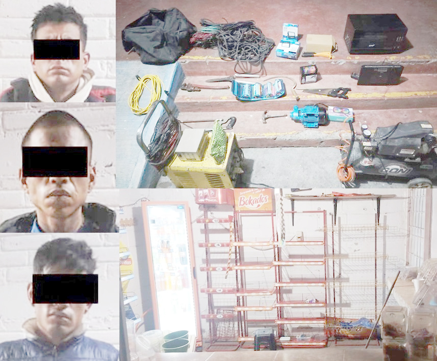 Ecatepec, Méx.- Tras una pronta respuesta a una llamada de auxilio, elementos de la Dirección de Seguridad Ciudadana y Tránsito Municipal detuvieron a tres sujetos señalados como responsables del robo cometido a escuelas e inmuebles destinados a actividades educativas, en un plantel de la colonia Del Carmen, de donde sustrajeron diversos artículos.