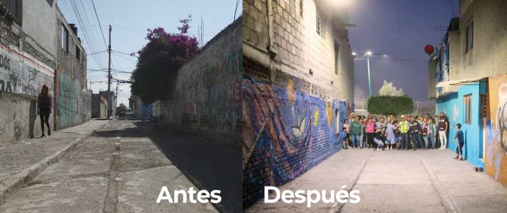 Durante tres días, un total de 15 muralistas se encargaron de plasmar en seis paredes diferentes murales con temáticas de niños, animales, fauna, no violencia y deporte, a lo largo de diversos callejones que la gente temía caminar y que hoy están iluminados.
