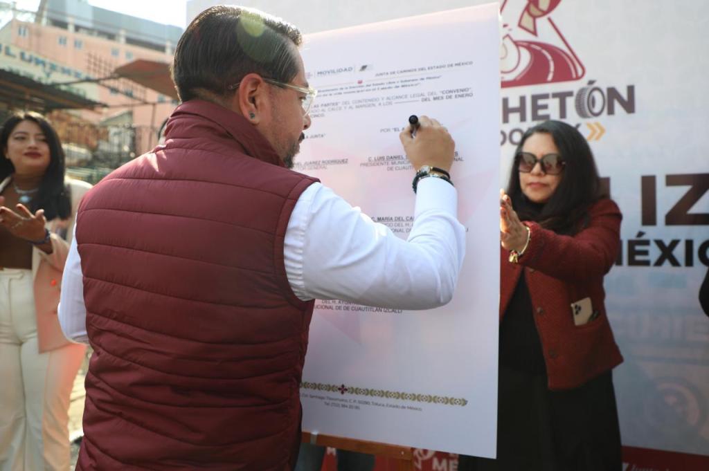 Al firmar el convenio de colaboración para que este municipio sea beneficiado por el programa estatal impulsado por la Gobernadora Delfina Gómez Álvarez, el Alcalde detalló que para lograr mejores vialidades, la Junta de Caminos del Estado de México dotará de la mezcla asfáltica y el gobierno municipal pondrá la mano de obra y la maquinaria.