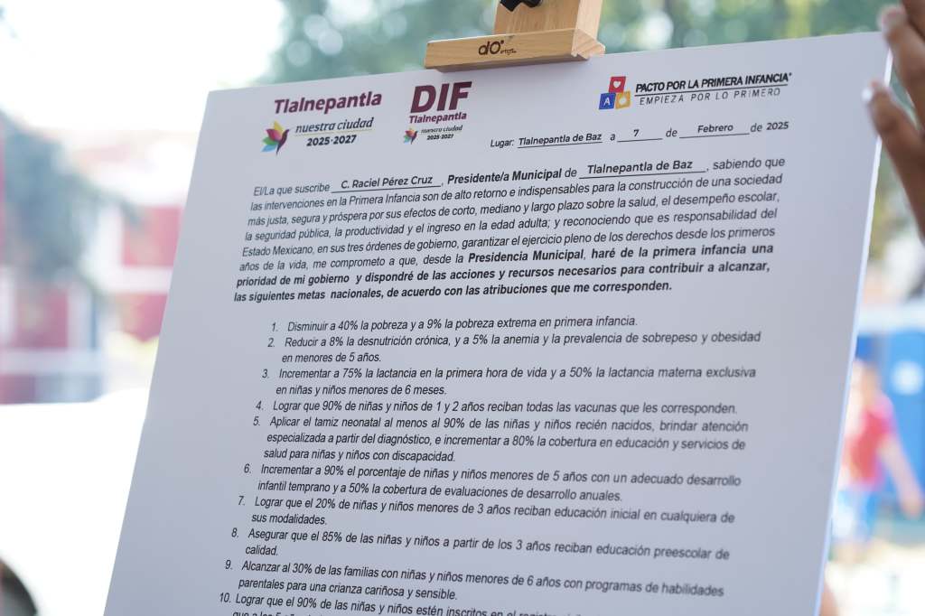 Acompañado por la presidenta honoraria del DIF Tlalnepantla, Rocío Pérez Cruz, el munícipe agregó que este pacto cuenta con 12 metas bien definidas como la reducción a 8% de la desnutrición crónica y a 5% la anemia y la prevalencia de sobrepeso y obesidad en menores de 5 años; incrementar a 75% la lactancia en la primera hora de vida y a 50% la lactancia materna exclusiva en niñas y niños menores de 6 meses; lograr que 90% de niñas y niños de 1 y 2 años reciban todas las vacunas que les corresponden; alcanzar que el 20% de niñas y niños menores de 3 años reciban educación inicial en cualquiera de sus modalidades.