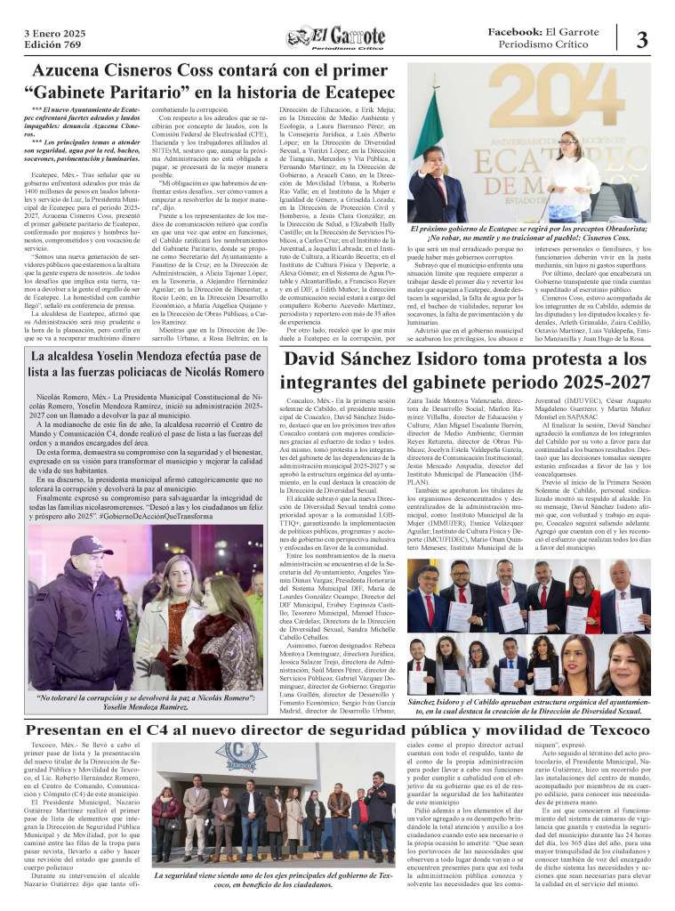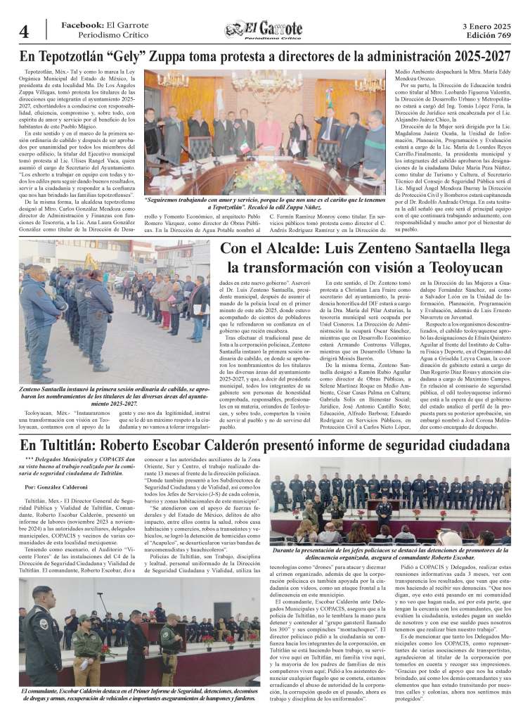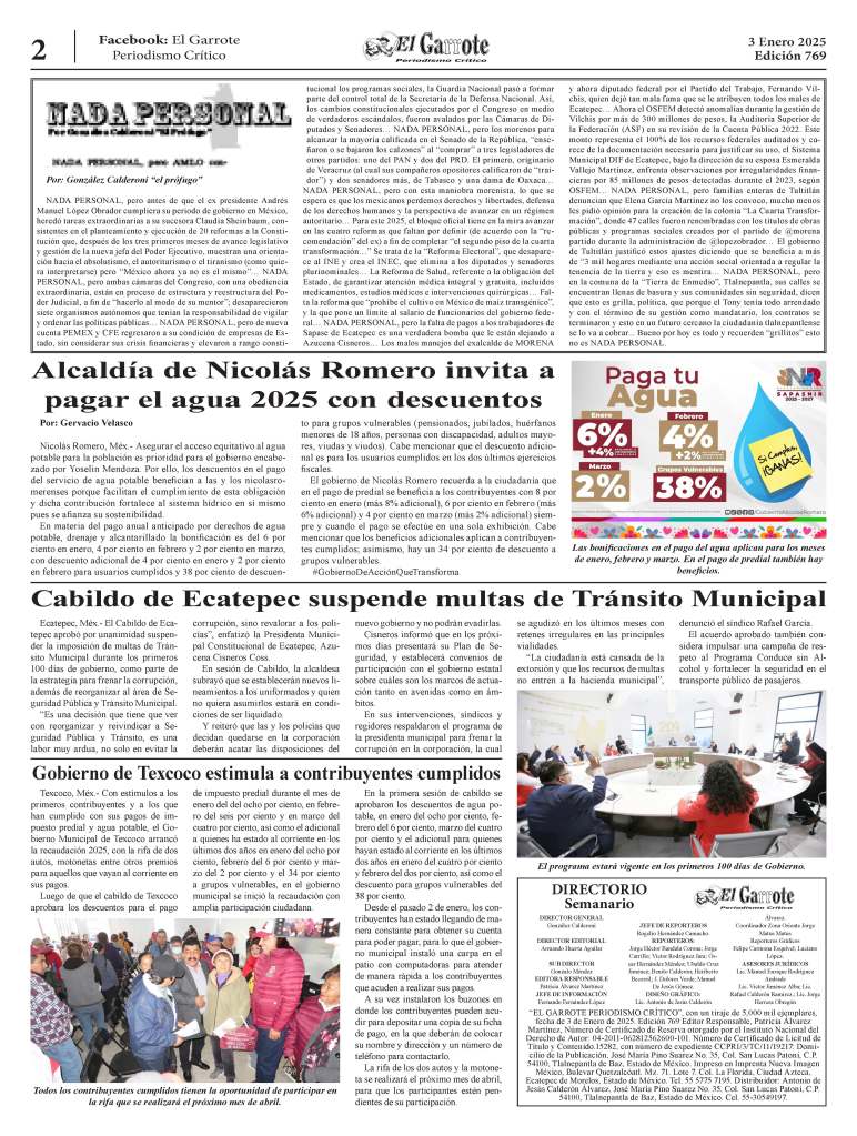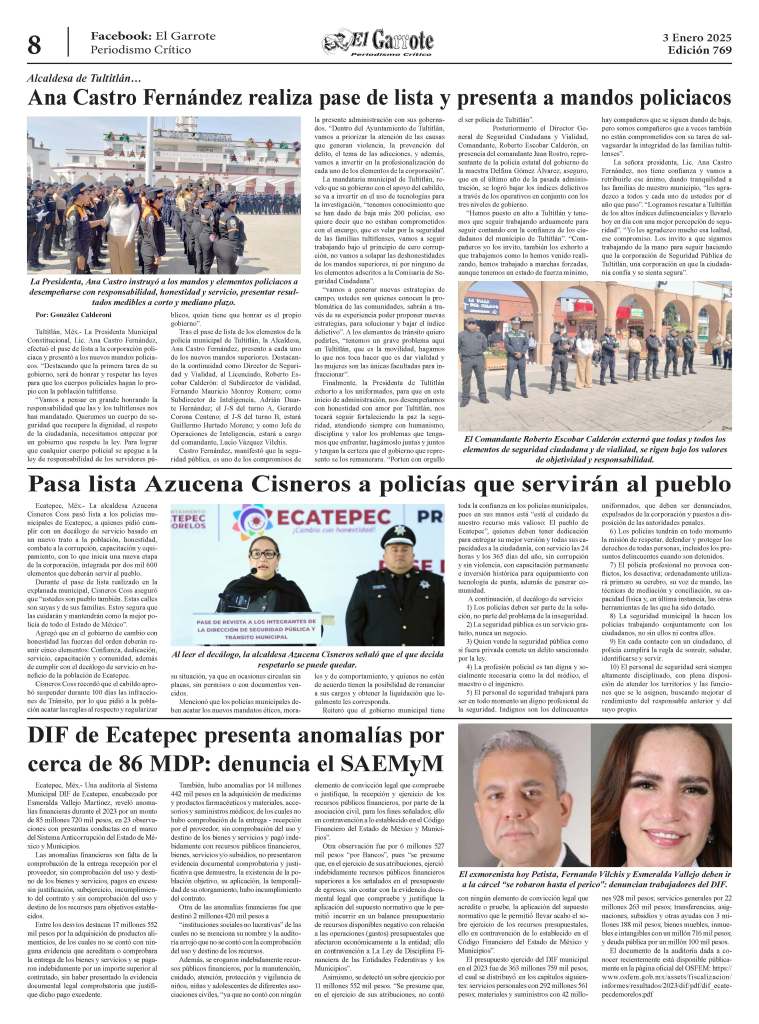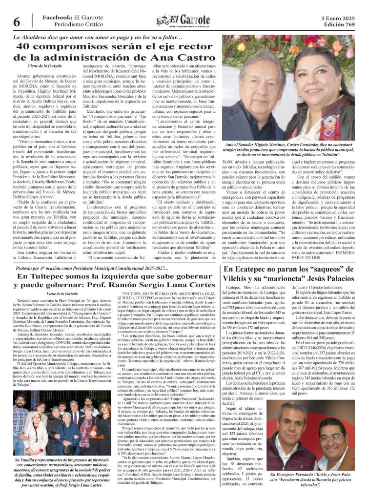 En la segunda conferencia de prensa, la presidenta municipal informó que el Plan Emergente “Por el bien de todos, primero agua para Ecatepec” contempla cuatro ejes prioritarios en los primeros 100 días: Combate al huachicoleo, Borrón y Cuenta Nueva, reparación de fugas y operación de pozos, con lo que busca devolver el derecho al agua a los ecatepenses al recuperar 300 litros por segundo de líquido por la red.