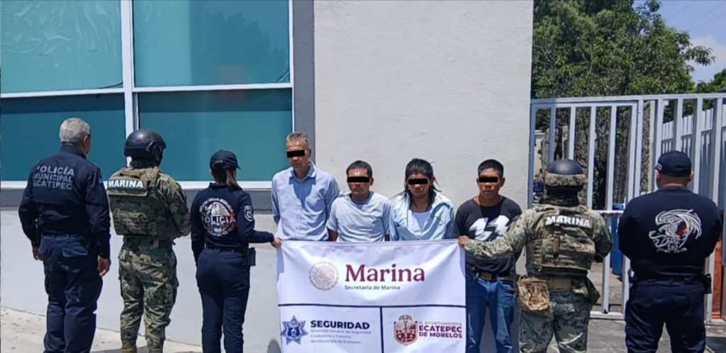 Ecatepec, Méx.- Elementos de la policía municipal, en coordinación con personal naval adscrito a Fuerza de Tarea Ecatepec de la Secretaría de Marina, lograron la detención de cuatro sujetos señalados como supuestos participantes del asalto a un local de telefonía celular en una plaza comercial de avenida Revolución, por lo que fueron presentados ante el Ministerio Público por robo con violencia.